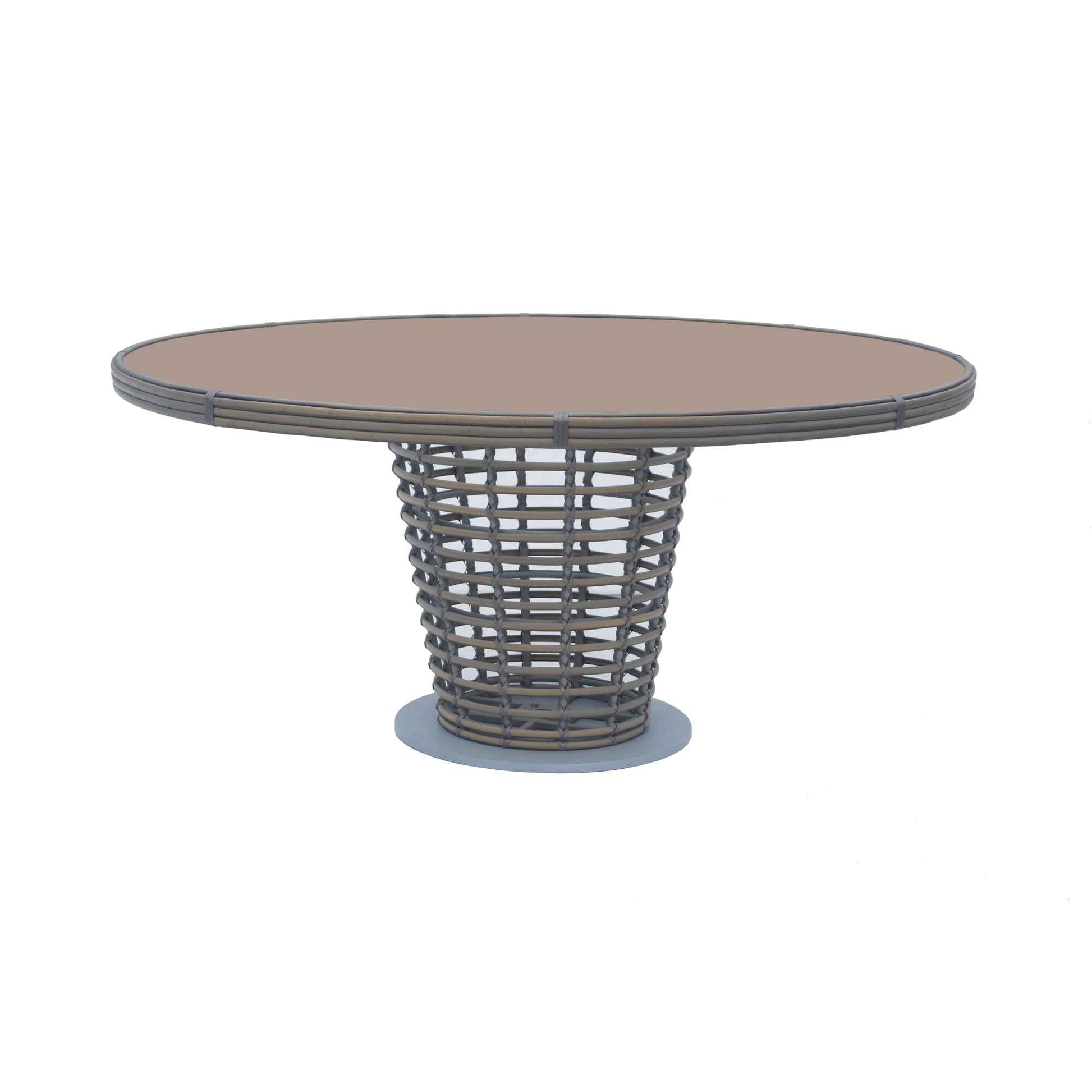 The Ruby Round Dining Table adds an elegant and airy feel to outdoor dining spaces. Its handwoven synthetic fiber frame in a silver walnut finish creates a unique floating effect. The tempered glass tabletop enhances durability while showcasing the intricate craftsmanship. Ideal for outdoor patios, terraces, and stylish alfresco dining.
