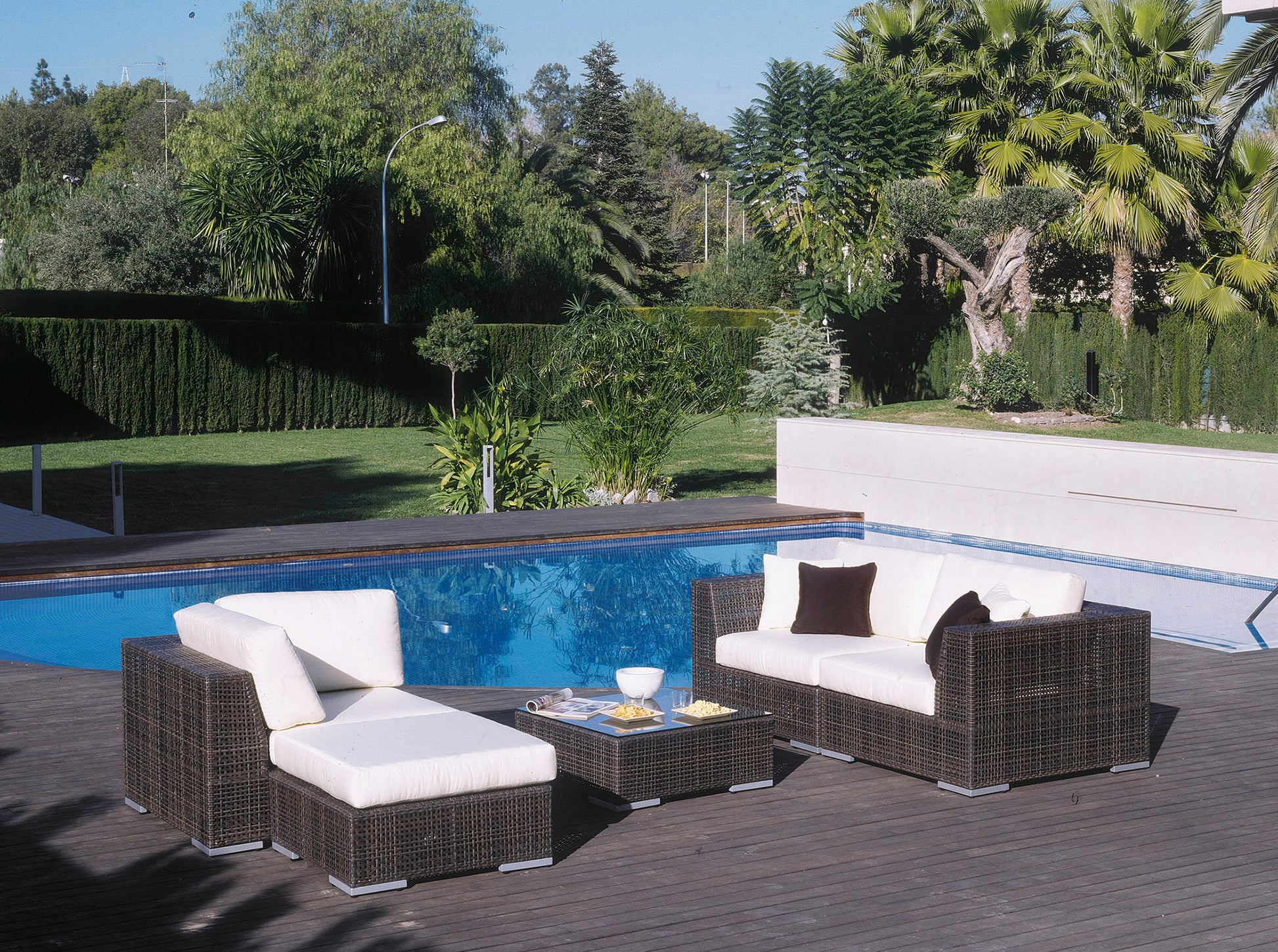 Introducing the Atlantis Collection - the ultimate blend of sleek, modern design and luxurious comfort for your outdoor patio. The 5 Piece Modular Sectional Set includes 3 corner chairs, 1 coffee table, and an ottoman, all featuring a fully anodized aluminum frame and Rehau Java Brown fiber weave. The high-quality Sunbrella cushions are available in a variety of colors and patterns to match your outdoor decor. The coffee table is reinforced with a thin sheet of Plexiglas for durability, and features a tempered glass top for added convenience. With its unique multi-colored textured surface, the Atlantis Collection is sure to impress and give you the freedom to create your own sectional, making you the envy of your neighbors. Experience contemporary, high-quality outdoor furniture like never before with the Atlantis Collection.