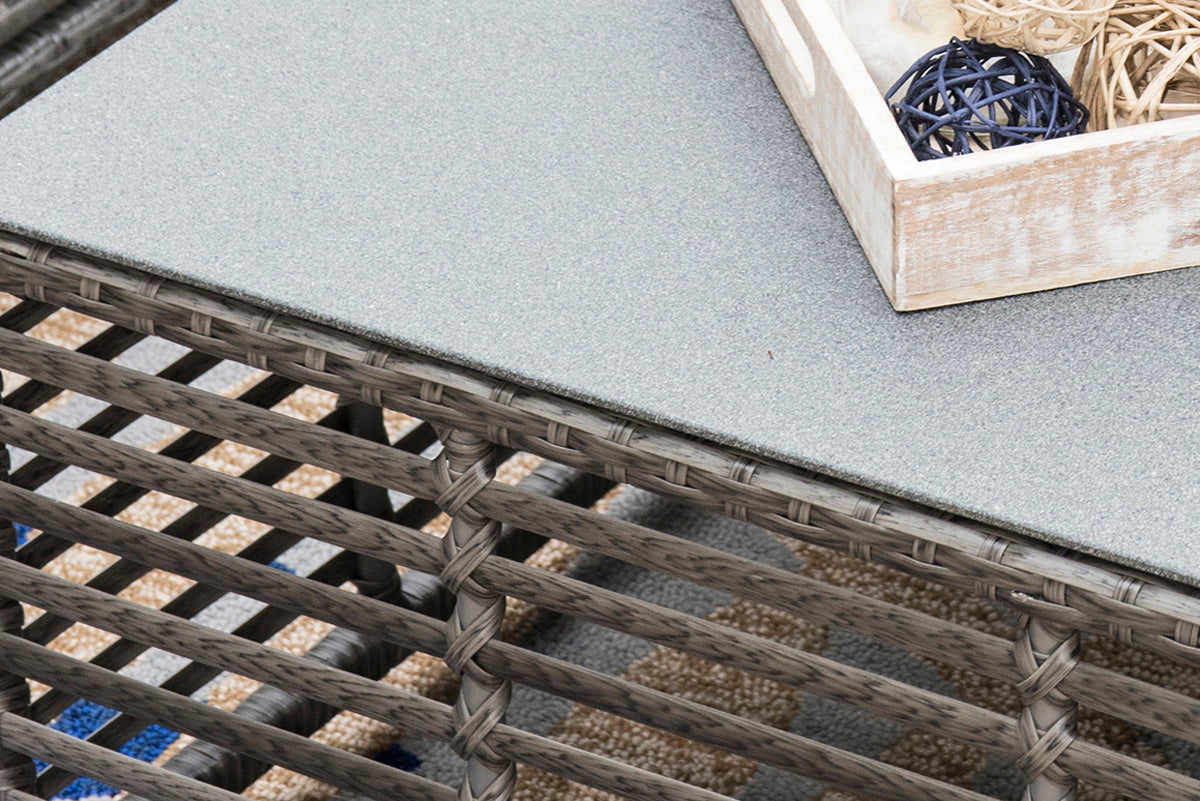 Introducing the Panama Jack Graphite Square Coffee Table with glass - a stylish and durable addition to your outdoor living area. Made from see-through grey fiber hand woven over aluminum frames, this coffee table from the Graphite collection is resistant to corrosion and scratching, making it ideal for any patio or backyard. You can easily combine it with other items from the Graphite collection to create a complete outdoor living area tailored to your needs. The table comes with tempered glass, so you won't have to worry about finding the perfect fit. Upgrade your outdoor space with this sleek and functional coffee table today.