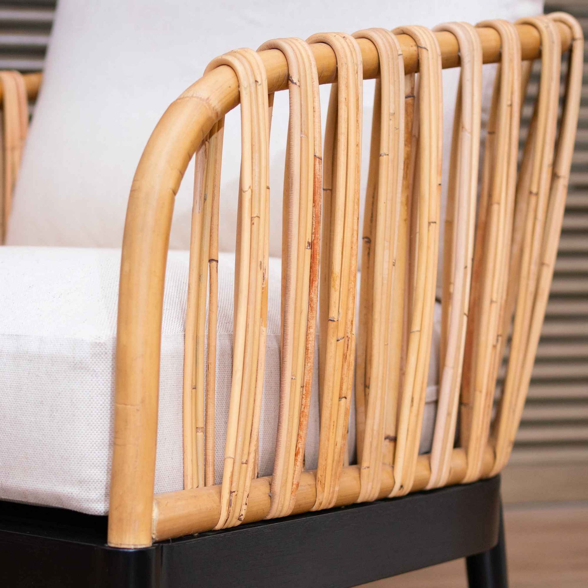 The Panama Jack Java Lounge Chair brings natural elegance and timeless appeal to your sunroom or indoor spaces. Crafted with a sturdy black wood frame and wrapped in natural pencil rattan, this chair showcases a harmonious blend of durability and artisanal design. Featuring an included indoor beige factory cushion, the chair delivers inviting comfort and effortless style. Customize the look by upgrading to indoor or Sunbrella fabric options to match your decor. Perfect for creating a cozy retreat, the Java Lounge Chair is fully assembled and offers contract-quality construction, making it a reliable choice for both residential and hospitality settings.