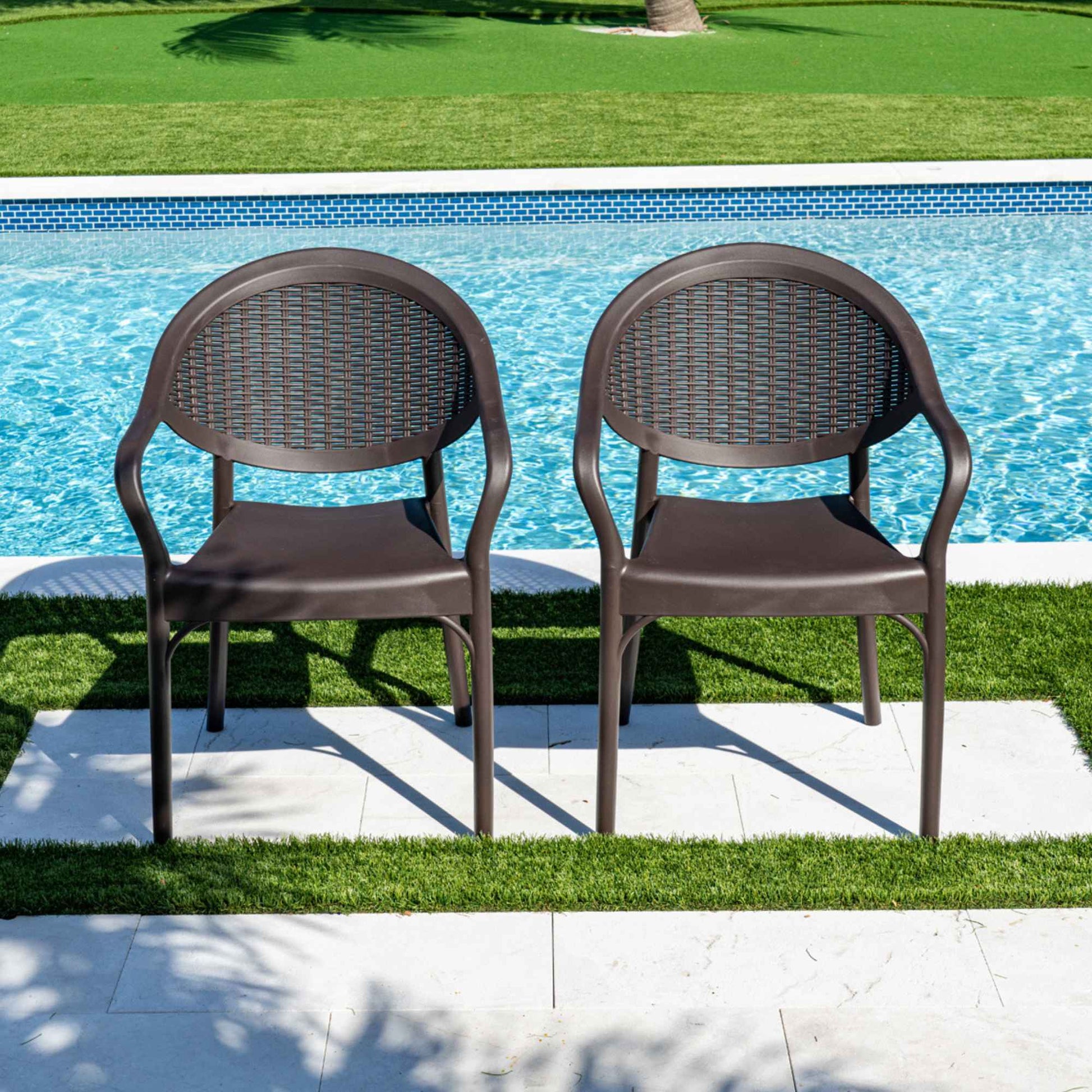Add contemporary charm to your outdoor spaces with the Mona Set of 2 Armchairs in a sleek brown finish. Expertly crafted from durable polypropylene plastic, these chairs are designed to withstand the elements while offering lightweight convenience. The ergonomic curved backrest with a woven design provides both style and superior comfort. Perfect for patios, poolside lounging, or garden dining, these armchairs are stackable for easy storage, making them ideal for both residential and commercial use.